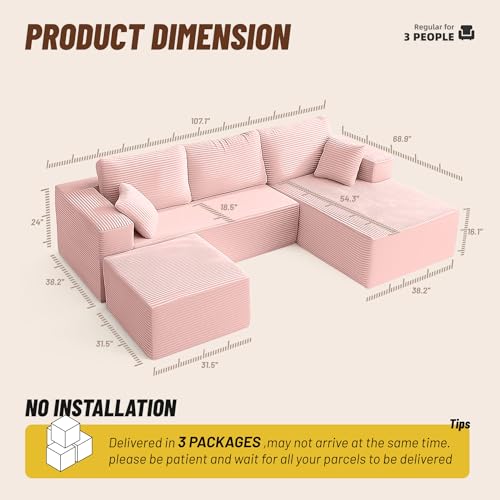 Specification: 107″ Boneless Couch with Deep Seat, Modular Sectional Sofa, Cloud Sectional Couch for Living Room, No Assembly Required, Corduroy, U-Shape 3 Seater Right, Pink