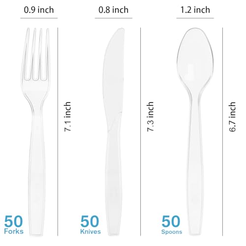 Specification: 150 Pcs Clear Plastic Silverware, Heavy Weight Plastic Forks Spoons Knives Disposable Utensils Cutlery Set for Wedding Party Supplies Everyday Use