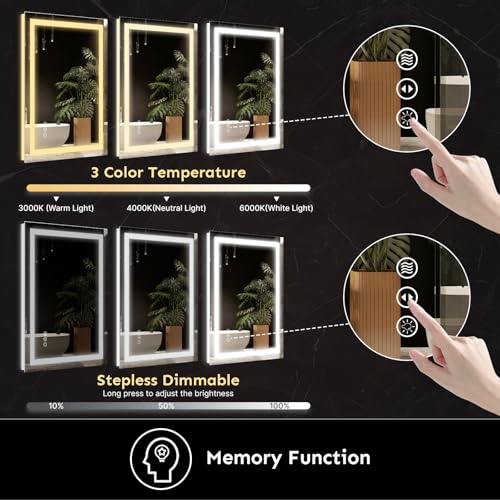 🪞[One-Touch Control & Shatterproof Design]No external switch needed! Our innovative touch-sensitive buttons are built into the mirror for hassle-free operation. Made with 4mm tempered glass, it’s 10x stronger than standard mirrors—withstands 90 MPa pressure (equivalent to a 22 lbs ball dropped from 40 inches). Anti-fog function keeps the surface mist-free post-shower. A sleek, frameless design adds modern elegance to any space.