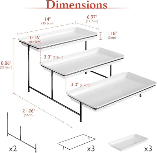 Specification: 3-Tier Melamine Serving Tray Set, 14″x7″ Platters for Serving Food, White Reusable Trays with Black Metal Display Stand for Cupcakes, Sevring Food, Dessert, Fruit, Cookie, Black