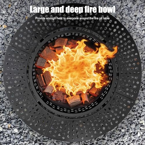 [Beautiful & Humanized Design]OutVue fire pit table comes with 2 height-adjustable and 360° swivel grills which disassemble freely. You’ll be able to barbecue, keep food warm or put pan to cook on them. The side of wood-burning fire pit is created with modern geometric cut-out design which catches firelight for creating fun shadows. The drilled design promotes airflow and keeps the fire strong. All sophisticated designs of the fire pits for outside are dedicated to the warmth and comfort for you.