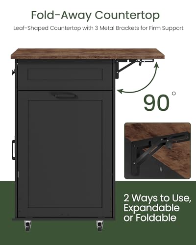 51.2″ Movable Kitchen Island Table with Foldable Top, Kitchen Island Cart with Storage, Trash Bin Cabinet, 2 Drawers, Spice Rack, Shelf Adjustable, Black and Rustic Brown MZD03BF