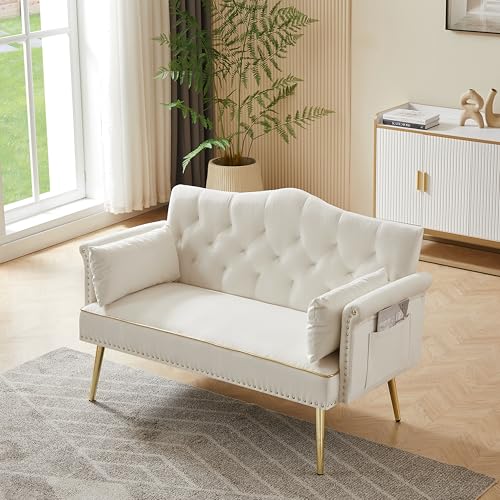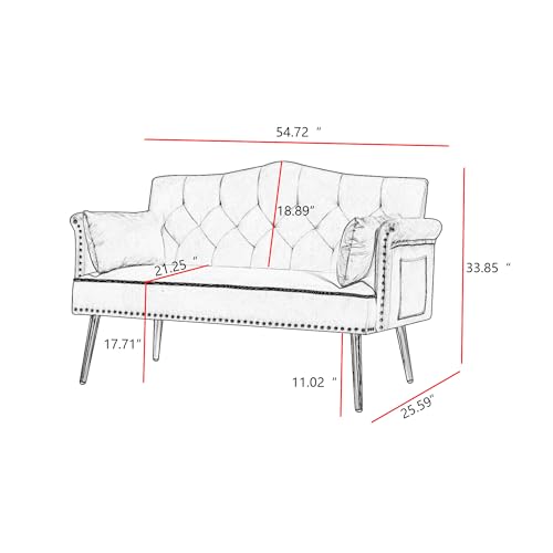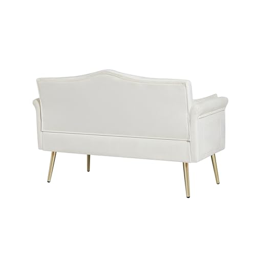 Specification: 55-Inch Modern Velvet Loveseat Sofa with Gold Metal Legs & Side Pockets, Tufted Backrest, Perfect for Living Room, Bedroom, or Office (Modern Beige)