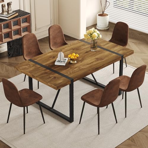 [Kitchen Table Chairs Set of 6] : This 6 chair dining table set features a table with a 2.3-inch thick high-density board top, supported by sleek black-painted metal table legs with a triangle design for added stability. The table’s surface is protected with an additional wood grain sticker, ensuring durability and creating a unique texture. The chairs, upholstered in suede nap fabric, provide a comfortable hand feel, enhancing the quality of the dining set for 6.