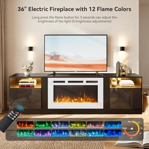 TV Stand with Electric Fireplace: Our fireplace TV stand is equipped with a white 36″ electric fireplace, which comes with 12 colors of backlight, 12 colors of light strip, 12 flame colors and 5 levels of flame brightness, providing different viewing experience and ambience with the remote keep watch over