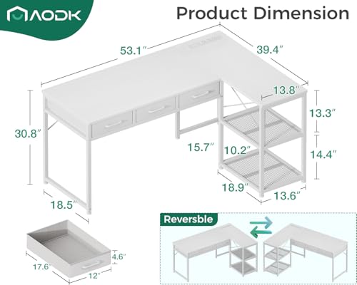 Specification: AODK 53 Inch L Shaped Computer Desk with Drawers, Corner Desk with Power Outlets & Reversible Storage Shelves, Movable CPU Stand for Home Office Gaming, White
