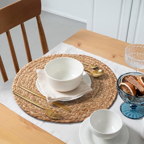 đžHANDCRAFTED FROM PREMIUM MATERIALS: Aofmee placemats are lovingly handwoven by skilled artisans, bringing together rustic charm and boho chic elegance. Each one tells a story of natureâs beauty. Believe the feel of 100% natural water hyacinth under your fingertips. Non-slip, heat-resistant, and anti-scalding, they protect your table from hot pots, spills, and scratches, at the same time as adding a natural touch to your dining space.
