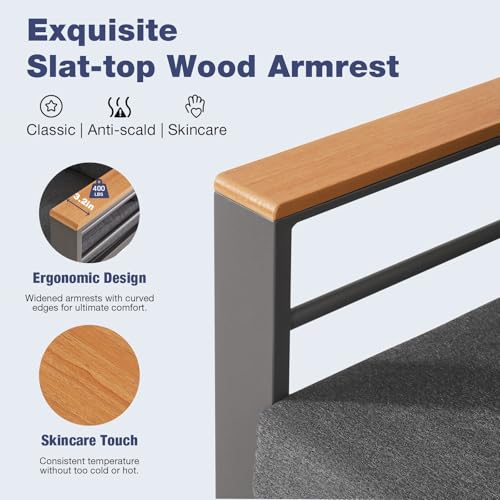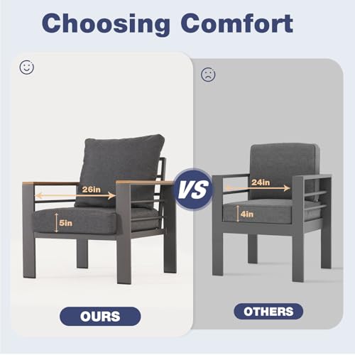 【UPGRADED】① Wider 26 in seat & Thicker 5 in cushion, (industry standard 24 in & 13 in); ② Reinforced Structure, Hurricane-grade steel frame with thickened support beams; ③High-end a luminum with heat treatment wood grain coating, more fashionable and reduce the metal heat in summer, protect the skin; ④Top Olefin fabric, easy to clean, ten years without fading