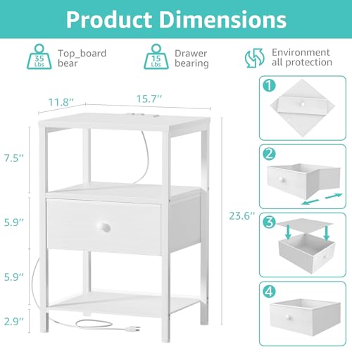 Specification: BOLUO White Nightstand with Charging Station, LED Night Stand with Fabric Drawers and Shelf, Bedside Table with USB Ports and Outlets, Bedroom Nightstand Modern
