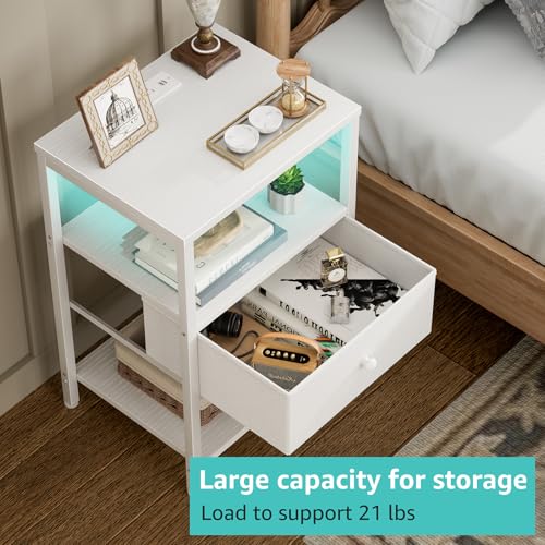 BOLUO White Nightstand with Charging Station, LED Night Stand with Fabric Drawers and Shelf, Bedside Table with USB Ports and Outlets, Bedroom Nightstand Modern