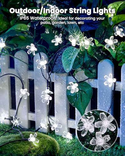 【Cherry Blossom Design】Experience the magic of spring all year round with these solar Christmas lights, inspired by flower – cherry blossoms. The 60 LED bulbs in each 26ft string (19.4ft lighting length, 6.6ft lead length) add a charming touch to your garden, and A couple of sets may also be connected for an even more enchanting effect;