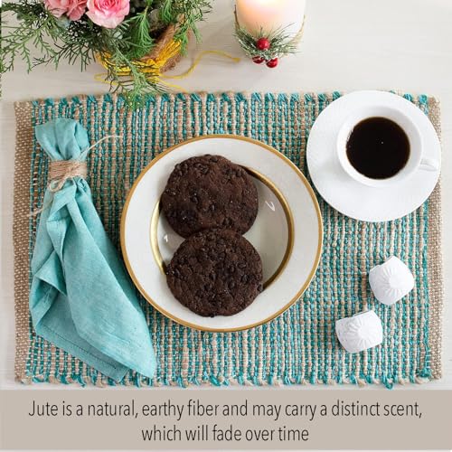 Chardin Home Natural Jute & Aqua Turquoise Placemats, Set of 4 – Rustic Handmade Boho Table Mats, 13×19 in Dining Table Placemats – Kitchen, Everyday Meals, Holidays, Farmhouse or Modern Table Décor