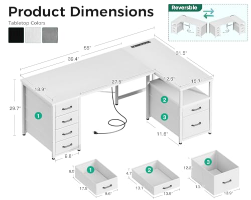 Specification: Coleshome L Shaped Computer Desk with 6 Drawers & Power Outlet, 55 Inch Corner Desk with Reversible Storage Shelf & File Drawer, Home Office Desk, White