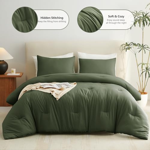 CozyLux Dark Olive Green King Size Comforter Set, 3 Pieces Solid Breathable Quilted Style Bedding Sets, Luxury Soft Bed Set with Down Alternative Comforter All Season (1 Comforter & 2 Pillowcases)