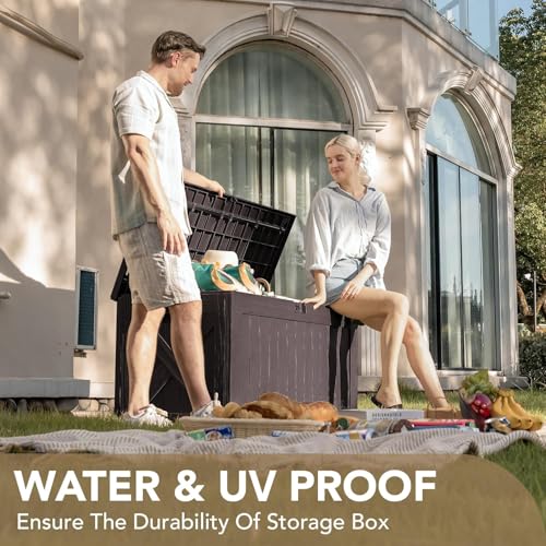 Specification: Devoko 120 Gallon Deck Box Resin Outdoor Storage Box Waterproof for Patio, Large Outdoor Storage Bench Lockable for Outside (Deep Brown)
