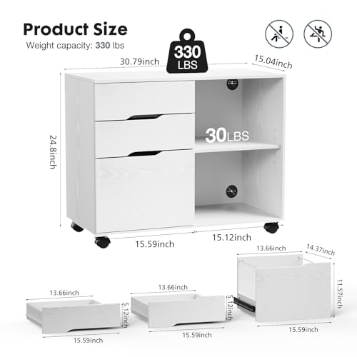 Specification: DUMOS Lateral File Cabinet with 3 Drawers Rolling Filing Cabinets Under Desk Storage Printer Stand Wood Organizer with Wheels Adjustable Shelf for Office Home Small Space, White