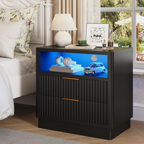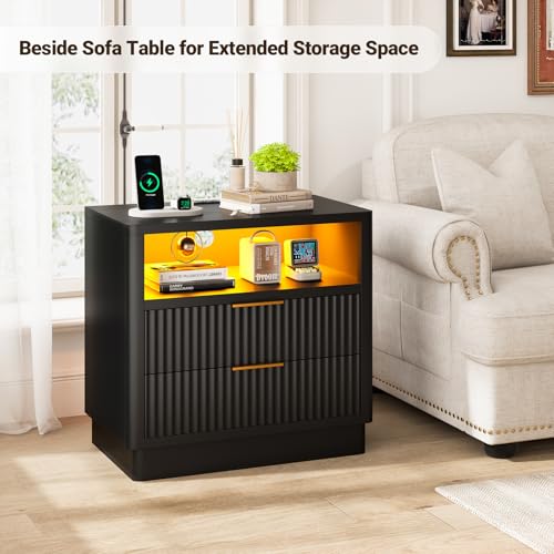 ELYKEN 24″ Fluted Nightstands Set of 2, LED Night Stand with Charging Station, 2 Pack Bedside Table End Table with 2 Drawers and Shelf for Bedroom Living Room, Black