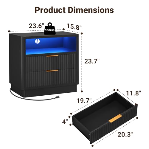 Specification: ELYKEN 24″ Fluted Nightstands Set of 2, LED Night Stand with Charging Station, 2 Pack Bedside Table End Table with 2 Drawers and Shelf for Bedroom Living Room, Black