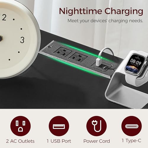 Handy Charging: The brand new side table boasts 2 AC outlets, 1 USB port and 1 Type-C port, allowing you to charge your phone without leaving the comfort of your bed. The cable hole organizes wires efficiently, preventing tangles and clutter