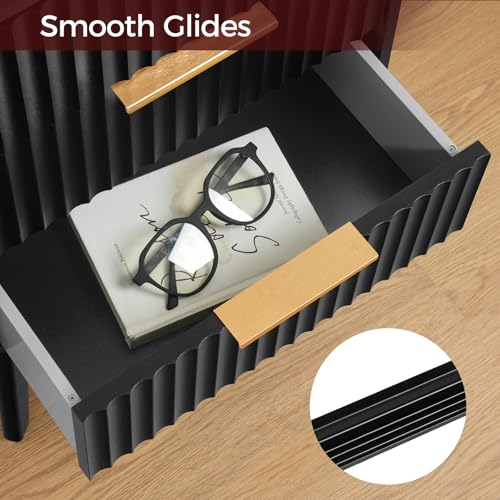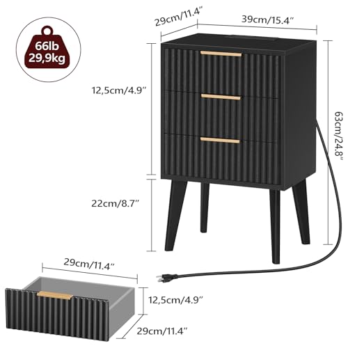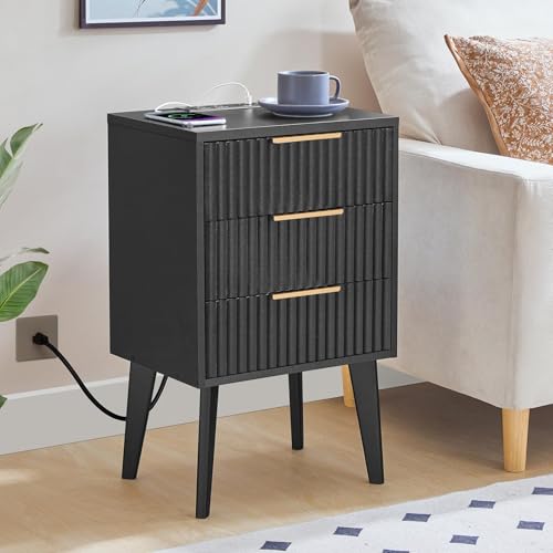 Specification: End Table, Fluted Night Stand, Modern Side Table with Charging Station, Bedside Table with 3 Drawers, Mid Century Nightstand, for Living Room, Bedroom, Study, Office, Black ETBK64E01