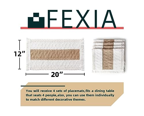 FEXIA Boho Placemats Set of 4, Macrame Table Decor Farmhouse Style Placemats in Natural Cotton Burlap, for Kitchen and Dining Table Centerpiece Home Decorations