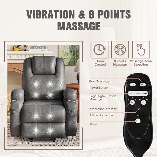 Vibration Massage: Our electric recliner chair is equipped with 8 vibration massagers that target the back, waist, thighs, and legs, effectively relieving muscle tension. With 3 adjustable modes and 3 intensity levels to choose between, it helps alleviate lower back pressure and beef up blood circulation, relieving stress and fatigue. The 15/30/60-minute timer function allows you to set the massage duration conveniently.