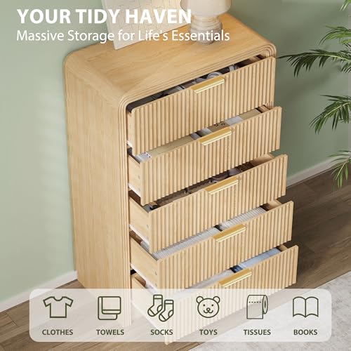 Fluted 5 Drawers Dresser, 48″ Tall Modern Chest of Drawers with Round Edge & Metal Handle, Wood Drawer Organizer for Living Room, Bedroom, Entryway, Hallway (Natural Oak)