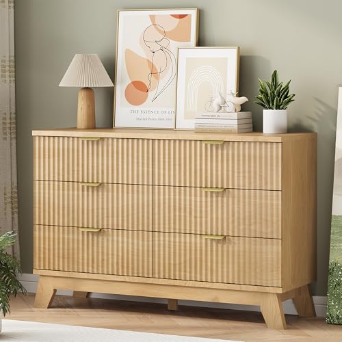 Fluted Dresser for Bedroom with 6 Drawers, 48″ Wide Modern Chest of Drawers with Metal Handle, Wooden Dresser TV Stand, Wood Closet Clothes Storage Organizer for Living Room, Hallway, Natural Oak