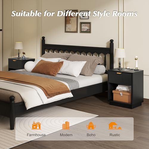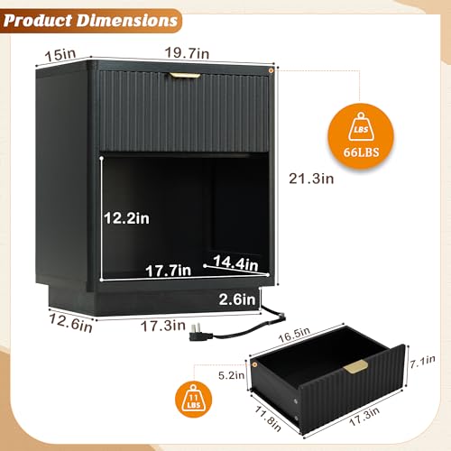 Specification: Fluted Nightstand Charging Station,Wood Modern Night Stands Storage Cabinet for Bedroom, Black Bedside Table with Drawers