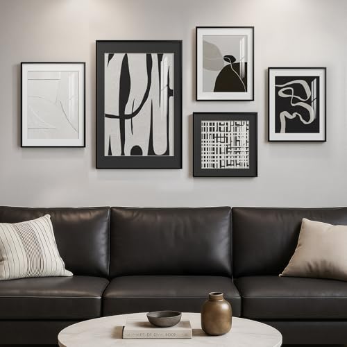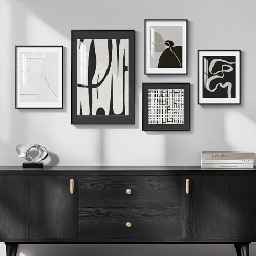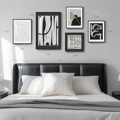 [Framed Wall Art Set]: A set of 5 black and white modern abstract wall art. The size of the 5 paintings are as follows: 1 piece of 12×16 inches, 1 piece of 16×24 inches, 2 pieces of 11×14 inches, and 1 piece of 12×12 inches. Each painting is framed in a sturdy, rust-proof, simple and fashionable black frame, perfectly blending with various decorative styles