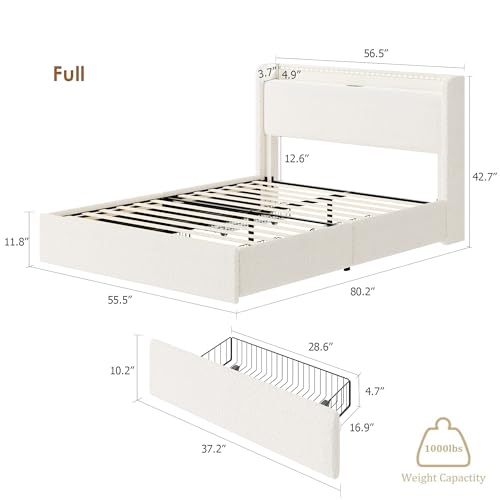 Specification: Full LED Bed Frame with 4 Storage Drawers and Storage Headboard, Soft Boucle Upholstered Platform Bed Frame with Charging Station and USB Ports, Solid Wood Slats Support, No Box Spring Needed, Cream