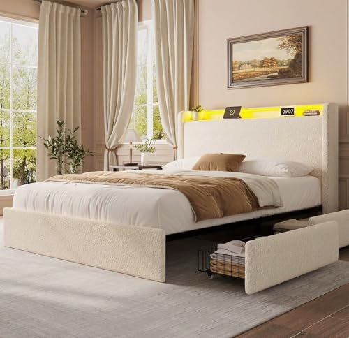Full LED Bed Frame with 4 Storage Drawers and Storage Headboard, Soft Boucle Upholstered Platform Bed Frame with Charging Station and USB Ports, Solid Wood Slats Support, No Box Spring Needed, Cream