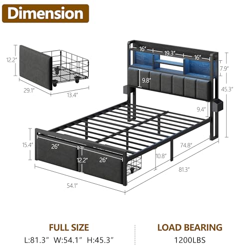 Specification: Furnulem Full Size Bed Frame with Headboard, Bed Frame Full Size with Storage Drawers, Charging Station and LED Lights, Metal Platform No Box Spring Needed, Upholstered Headboard, Noise Free, Black