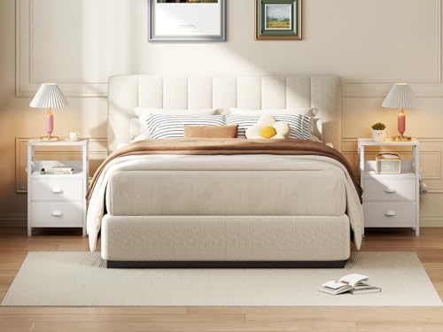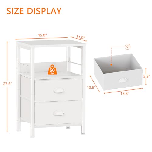 Specification: Furologee Nightstands Set of 2, End Table with 2 Fabric Drawers, Night Stand with 2 Hooks, Open Wood Shelf Bedside Table for Bedroom/Living Room/White