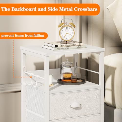 Furologee Nightstands Set of 2, End Table with 2 Fabric Drawers, Night Stand with 2 Hooks, Open Wood Shelf Bedside Table for Bedroom/Living Room/White