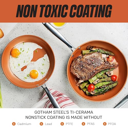 Gotham Steel 9.5 Inch Copper Non Stick Frying Pans, Ceramic Non Toxic Frying Pans Nonstick Skillet Made Without PFOA PFOS, Lightweight, Stay Cool Handle, Oven and Dishwasher Safe