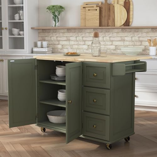 Homestyles Mobile Kitchen Island Cart with Wood Top and Dropleaf Breakfast Bar, 18″ D x 53.5″ W x 36″ H, Green