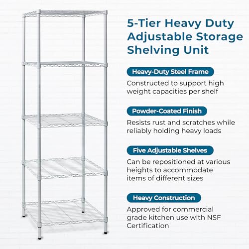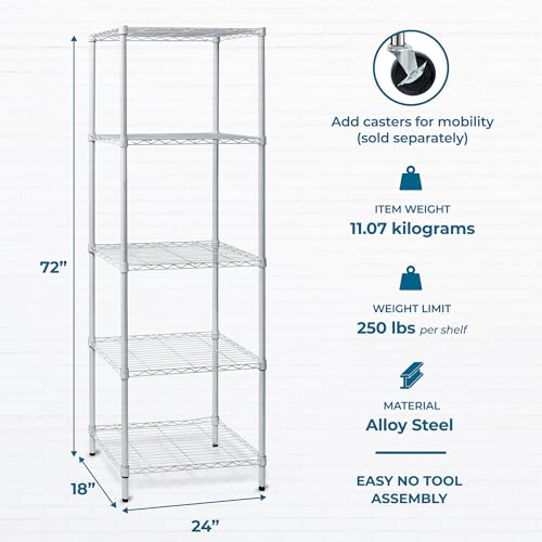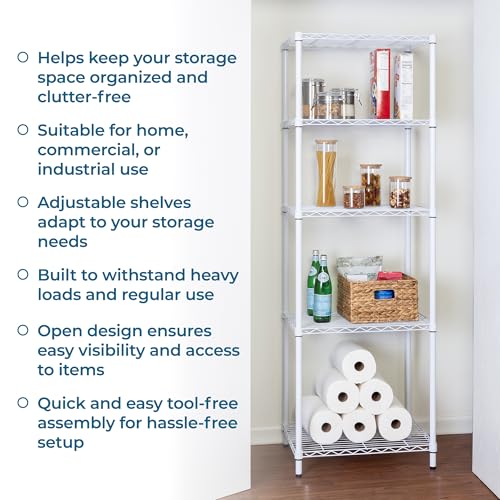 You are searching for a shelving unit that may be versatile – that could serve as garage shelving or kitchen shelves. You want adjustable shelves for when your storage needs change or that oh-so-random item comes home and doesn’t fit on the shelves as-is. Well, your shelving ideas are just a click away. This 5-Tier Adjustable White Storage Shelf is all that and more, having the ability to hold up to 250 pounds on every shelf and a steel frame construction that gives it industrial quality, making it the very best kitchen, garage or closet shelving unit. And if you wish to move it around, you’ll purchase wheels on the way to provide the portability You want, with the functionality and style you desire.