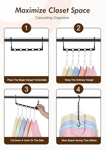 Newly Designed Easy To Use Magic Hangers – Each clothing hanger has 5 holes slots to prevent clothes from slipping and falling. Our cascading hangers also feature swiveling 360 degree rotating hooks with a wide diameter to fit a large range of closet rack rods.