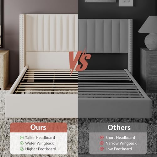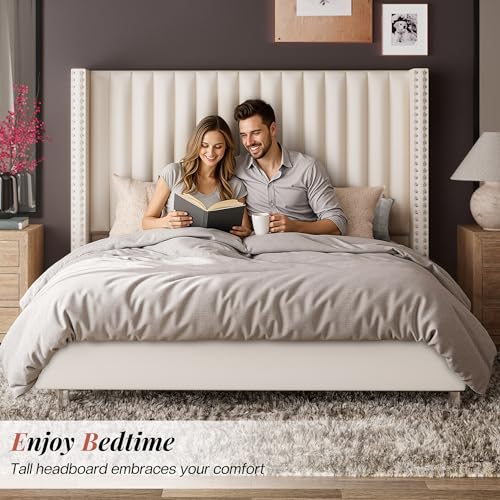 Specification: Jocisland Queen Size Upholstered Platform Bed Frame with Tall Wingback Headboard, Velvet Modern Luxury Design, No Box Spring Needed, Easy Assembly, Cream