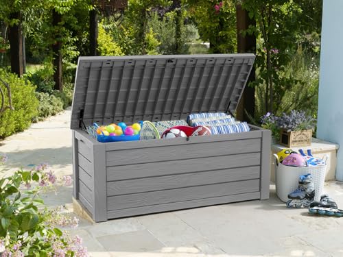 Specification: Keter Westwood 150 Gallon Resin Large Outdoor Storage Box for Patio Furniture, Outdoor Cushions, Garden Tools and Pool Floats, Light Grey