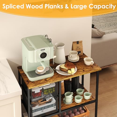 【Sturdy and Stable】The kitchen storage rack features a design that combines ironwork and wood, enabling it to effortlessly bear a load of 100 pounds. The microwave stand cart with storage is equipped with thickened wooden shelves, a metal frame, and high-density wire mesh drawers and shelf. These elements not only endow it with remarkable load-bearing capacity and durability but also give a boost to its aesthetic appeal with a touch of vintage craftsmanship.