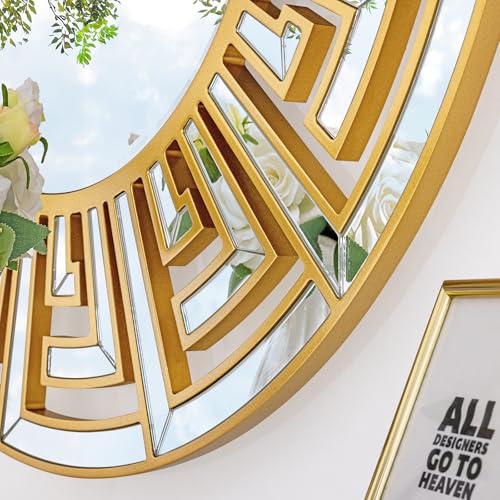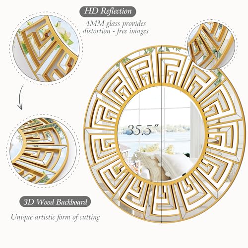 Large 35.5″x35.5″ Round Mirrors for Wall Decor with Gold Geometric Pattern, Beveled Edge, Gold Decorative Mirror for Retro Living Room, Stylish Entryway, Bedroom and Bathroom