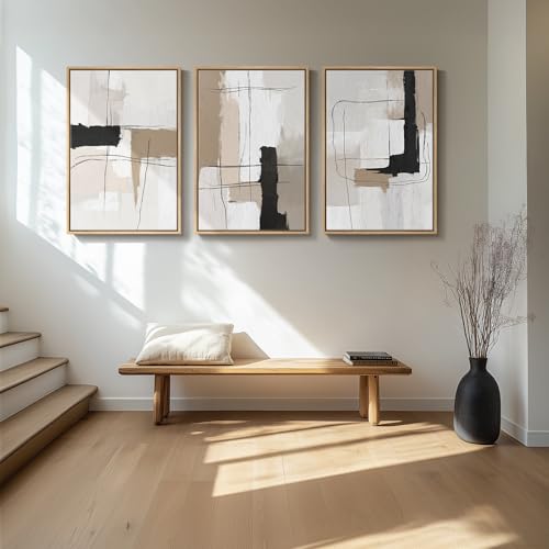 [Abstract Wall Art]: This set of black and white neutral abstract wall art, crafted with simple lines and color blocks, combines neutral tones like black, white, gray, and beige. It is both simple and layered, suiting diverse decor styles. The solid wood frame adds natural warmth and boosts the decorative effect. Ideal wall decor for living room, hallway, stair, bedroom, place of job and more space, it easily elevates the space’s style