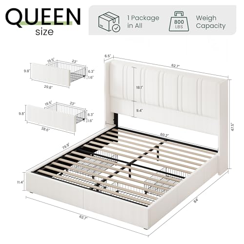 Specification: LARMACE Queen Size Bed Frame with 4 Storage Drawers and Wingback Headboard Linen Upholstered Platform Bed Frame with Wooden Slats, Easy Assembly, White