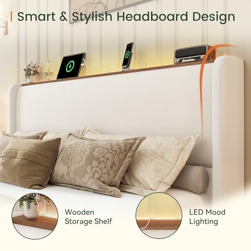 LARMACE Queen Size Bed Frame with LED Lights and Charging Station Linen Upholstered Platform Bed Frame with 51.2″ Tall Headboard Wingback and Storage Shelf, No Box Spring Needed, Noise Free, Beige