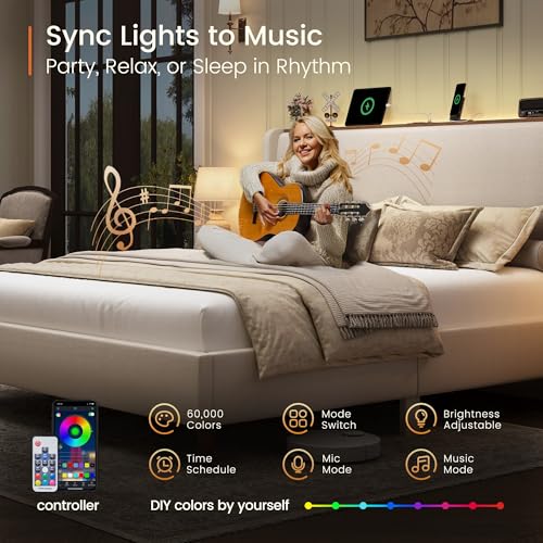 【Bed Frame with RGB LED Light】 Develop into your space into a cozy retreat with our queen bed frame; Keep an eye on colors, brightness, and even set flashing modes or sync with your music the usage of the intuitive app or remote Keep an eye on; It’s not just a bed–it’s your personal mood setter for relaxation or entertainment
