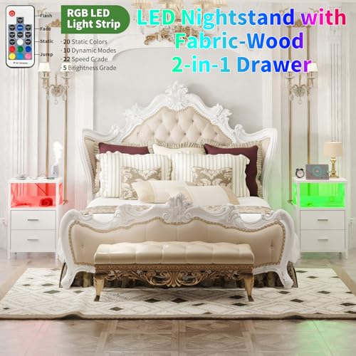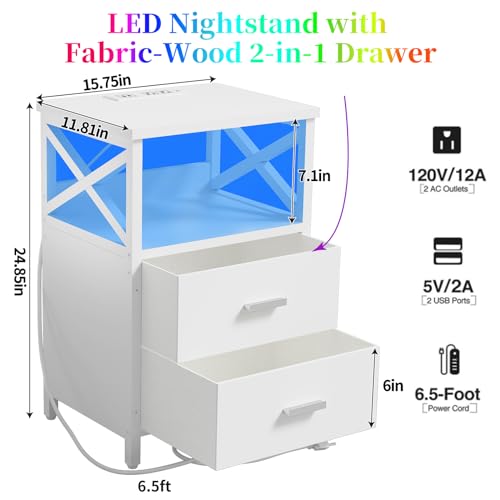Specification: LED Nightstand with Charging Station, Side Table with USB Ports and Outlets, End Table for Small Spaces, White Bedside Tables with Fabric-Wood 2-in-1 Drawer for Bedroom, Living Room, Office