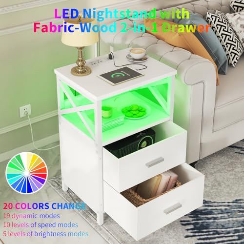 LED Nightstand with Charging Station, Side Table with USB Ports and Outlets, End Table for Small Spaces, White Bedside Tables with Fabric-Wood 2-in-1 Drawer for Bedroom, Living Room, Office