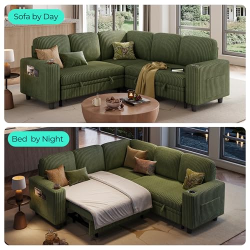 Specification: LINSY HOME Sectional Sleeper Sofa with Pull Out Couch Bed – Convertible Plush Corduroy Cloud Couch with Storage Chaise & USB Charging, Comfy L Shaped Modular Couches for Living Room Apartment, Green